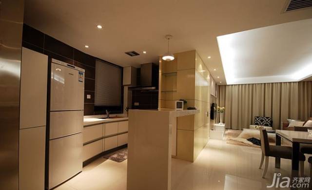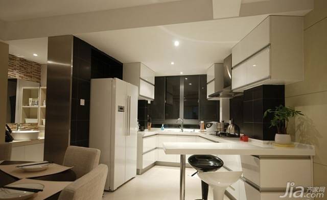 利用1.6米的吧台立面隔开了客厅与开放式厨房,让家居看上去加大了一些视觉上的空间感。