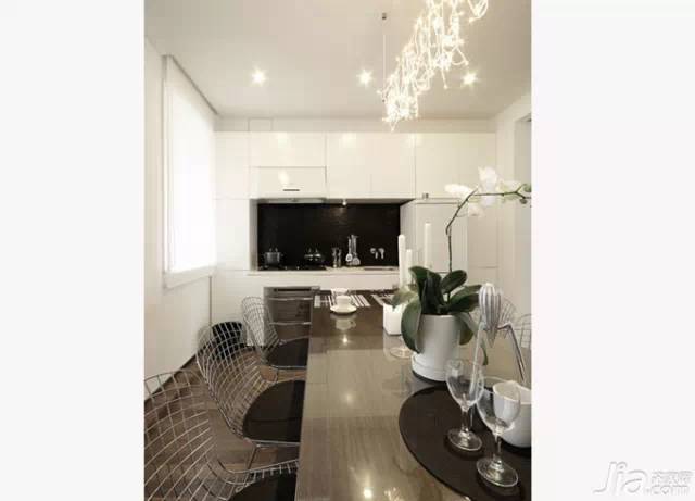 纯白色的厨房橱柜看起来虽干净纯洁但棱角分明,但餐厅处流光状的可爱灯具以及简约个性的餐椅又立刻让这个空间变得轻松有活力起来。