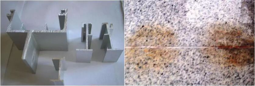 幕墙结构需采用不锈钢或者铝合金来连接,出于成本考虑,不锈钢运用得更为广泛一些,也有一些施工企业偷工减料,以不锈铁以次充好,在建筑建成初期影响不大,但随着投人使用的年限增长,金属表面镀锌层受到磨损,在水份的氧化作用下形成氧化铁,铁锈容易通过连接部位渐渐往外渗透,从而导致石材面板出现锈痕。石材研习社(IDstone5A)