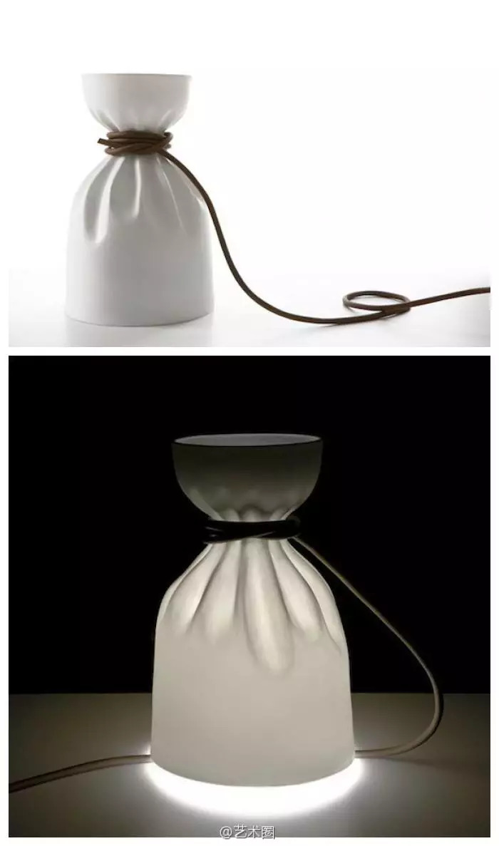 将薄陶瓷塑形成一个收紧状的口袋,把灯的电源线用皮革包裹起来,看起来就像是皮绳捆绑着袋口,很特别的设计。