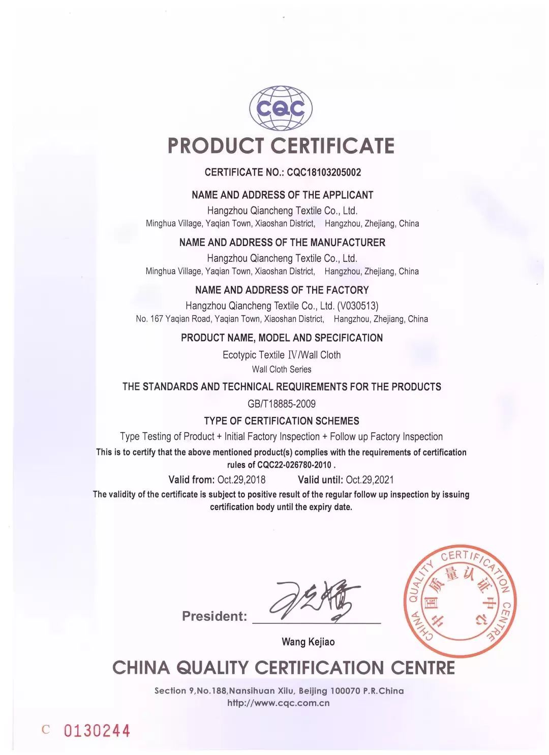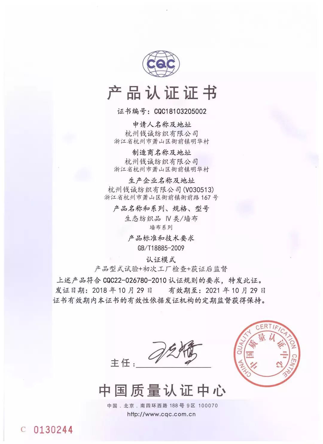 2018年10月29日,中国质量认证中心(以下统称“CQC”)向美家美户•无缝墙布颁发中国生态墙布系列产品认证证书。美家美户再度率行业之先,继ISO14001环境管理体系认证,ISO9001质量管理体系认证证书后,成为首批获得CQC生态墙布系列认证的品牌,成功引领行业开启墙布系列强制认证时代。美家美户再次以实际行动,彰显了行业领导品牌的卓越实力。