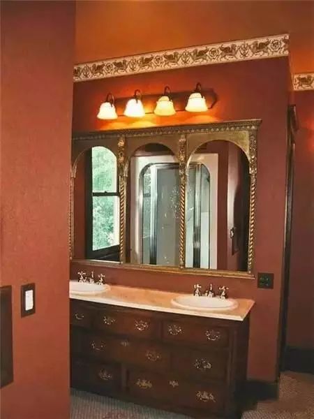 卫生间面积很大,但仍然需要改造,看看这间卫浴间,古典风格没有错,但把卫浴间装修得太暗,显得非常狭窄。