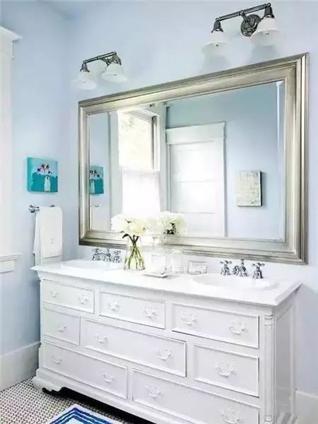 浴室柜的样式并没有改,但重新漆过的白色顿时让卫浴间有了光彩。将原先的深色墙面改为淡蓝色,又让空间明亮了N倍。