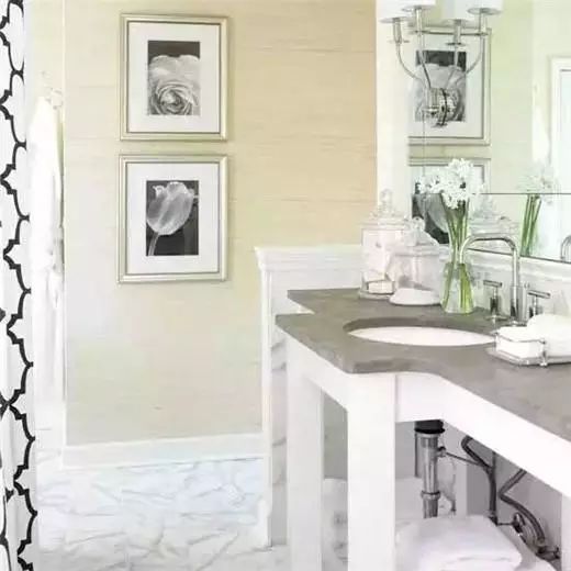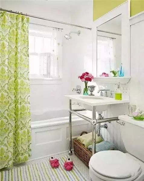 卫生间狭小阴暗,可以尽量多用白色来提亮。卫浴设备的材质、布艺软装的色彩都很重要。