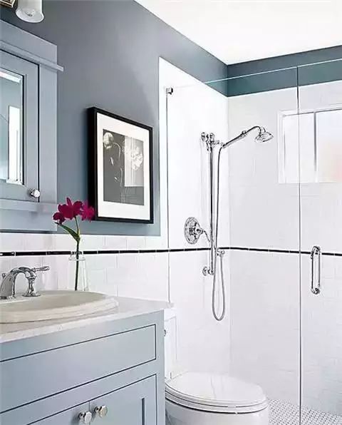 稍微改一下配色,卫浴间顿时高大上了起来。增加了造型简洁的浴室柜和明亮大方的玻璃门淋浴房。