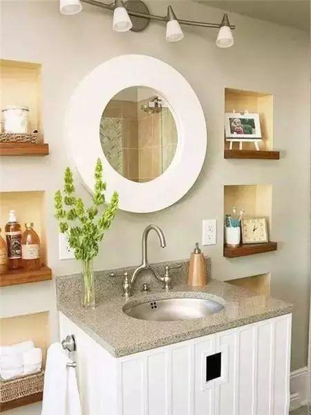 墙面设计是神来之笔,圆形的镜面与两侧6个方形的墙面凹槽相映成趣,收纳空间顿时翻倍。镜面下方安排了四个插座。